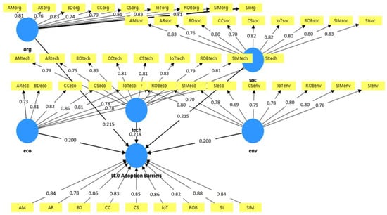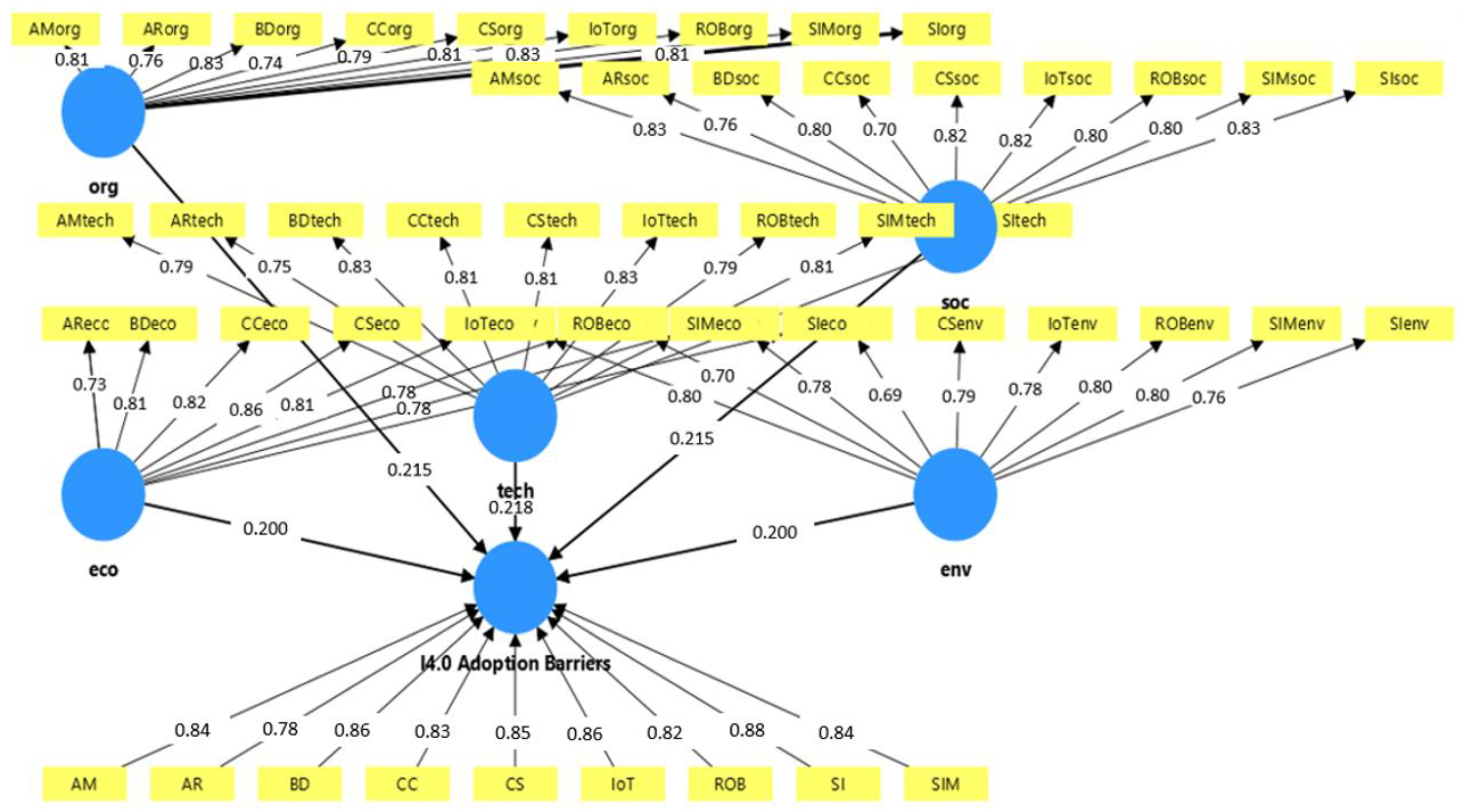 The hypotheses (H1–H5) posit that economic (ECO), environmental (ENV), organizational (ORG), social (SOC), and technological (TECH) factors act as prominent barriers to adoption. These hypotheses are grounded in a structural equation model (SEM) that employs a first-order construct (I4.0 Adoption Barriers) and a second-order constructs (ECO, ENV, ORG, SOC, TECH). Each hypothesis is described in Table 2.