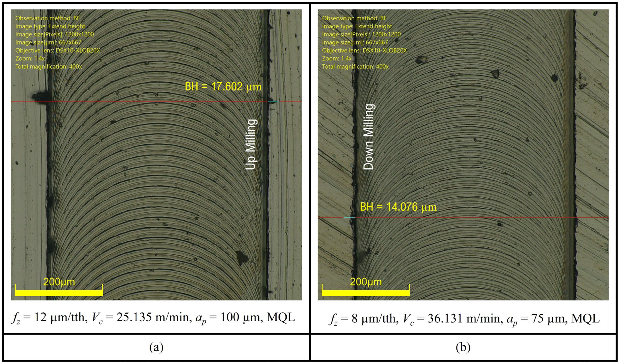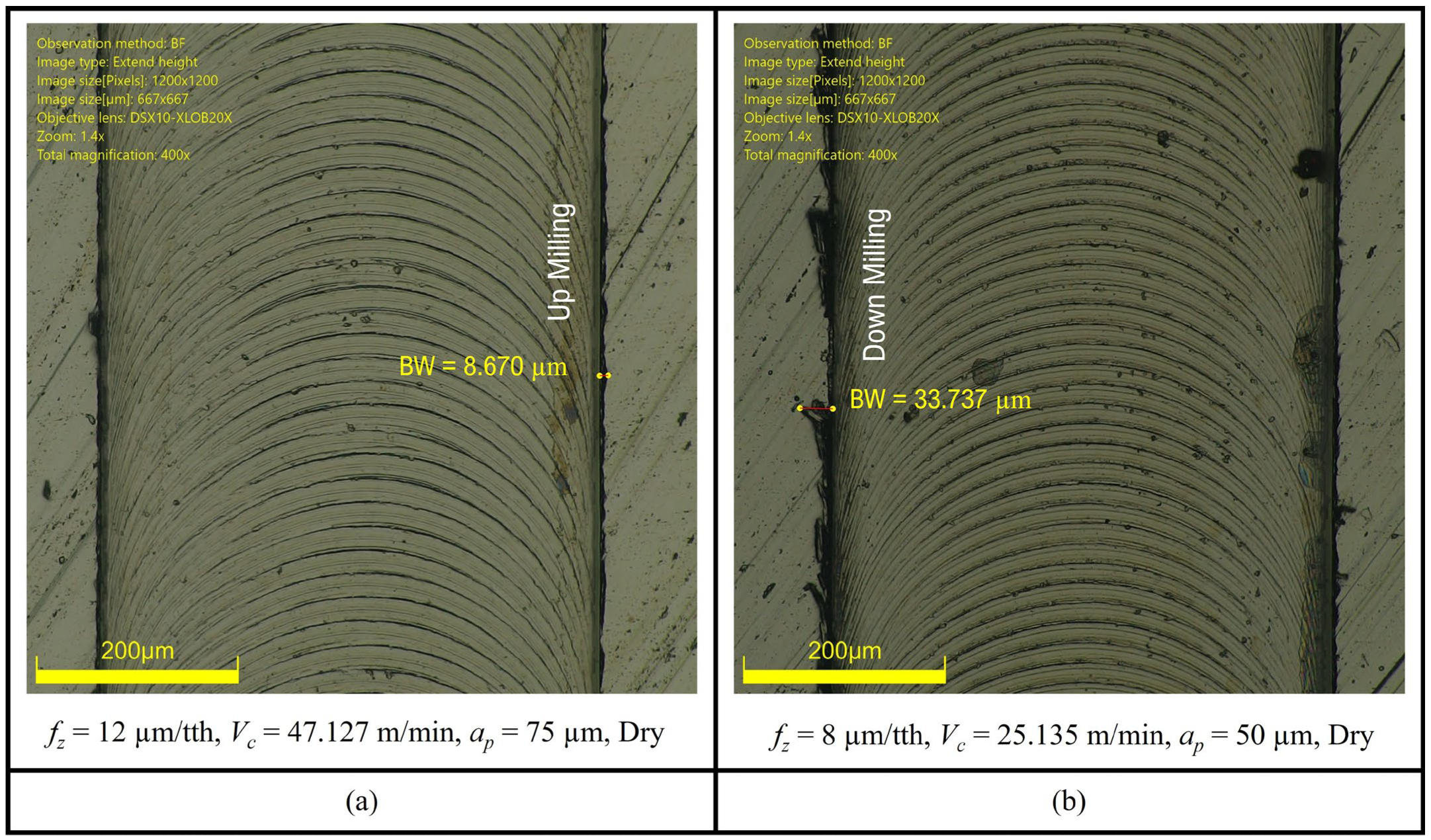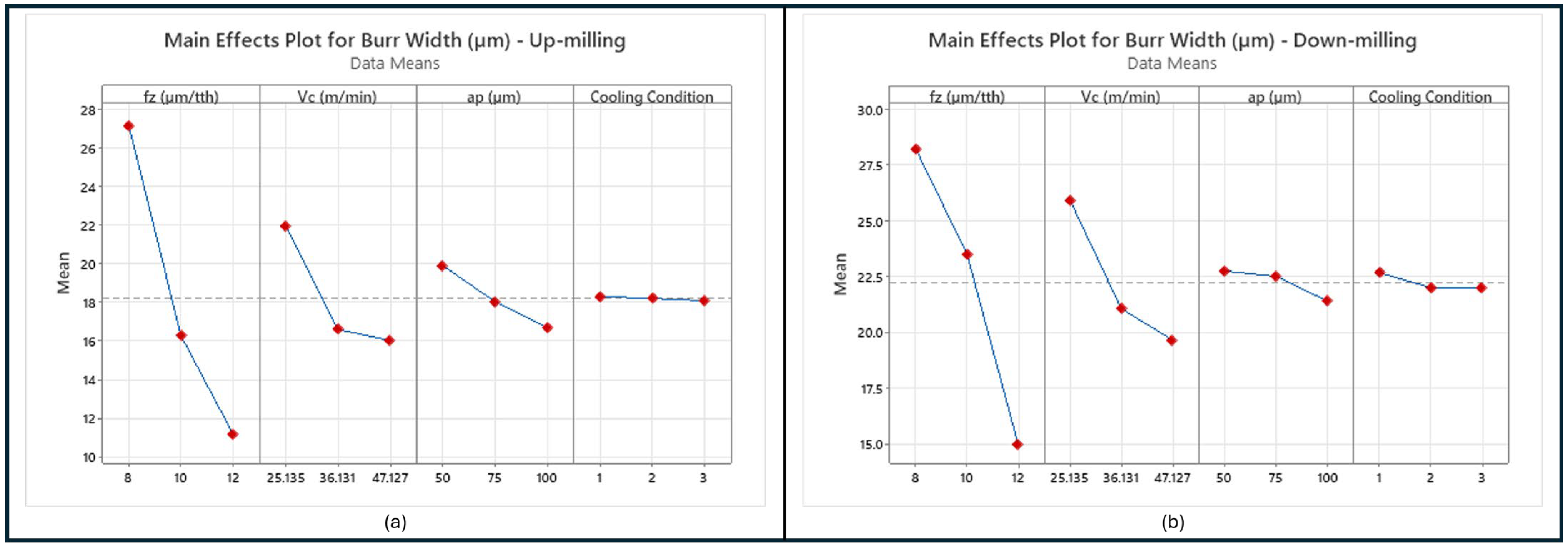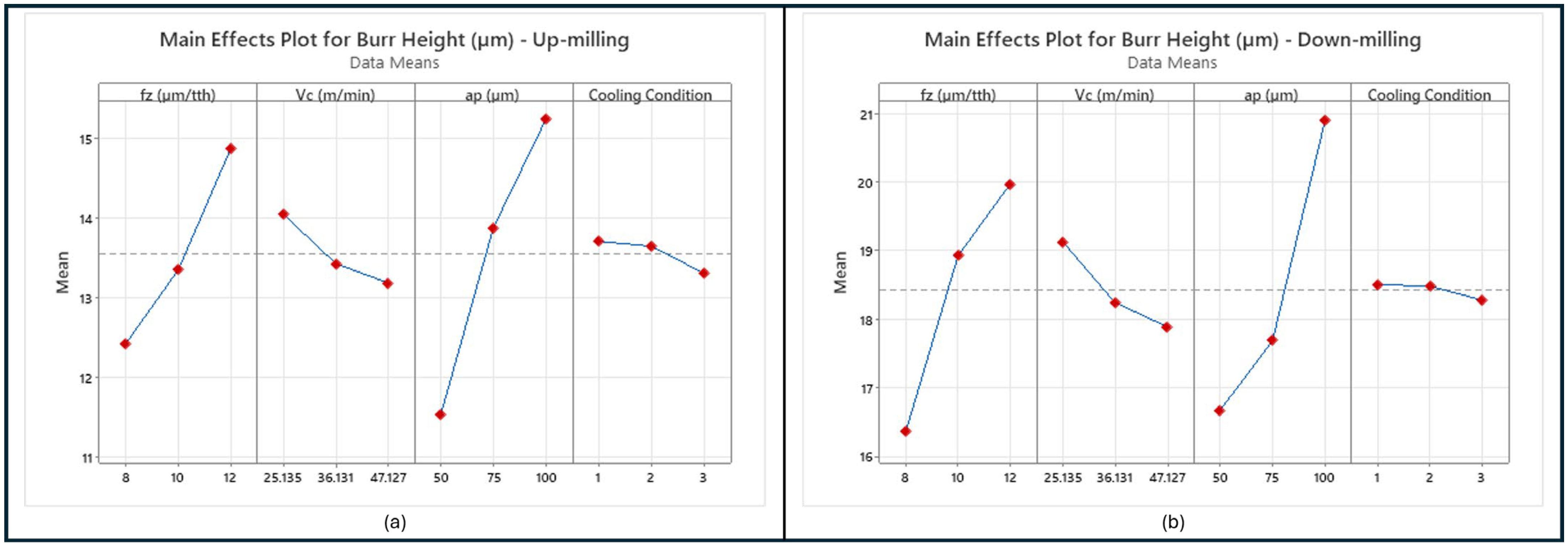 - Feed rate, followed by cutting speed, emerged as the most significant factors influencing burr width, contributing a combined 89.06% in up-milling and 92.67% in down-milling. In contrast, the depth of cut and cooling condition had a minimal influence on burr width. Burr height, however, was primarily affected by the depth of cut and feed rate, while cutting speed and cooling condition showed negligible impact. The combined effect of depth of cut and feed rate accounted for 77.36% of the variation in burr height during up-milling and 73.95% during down-milling.