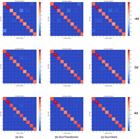 Additionally, the signal-to-noise ratio (SNR) was systematically adjusted from −10 dB to 10 dB to evaluate the variation in diagnostic accuracy of the proposed framework under high-noise scenarios, as shown in Table 1. Results indicate that the MSCNN+GRU+CBAM model maintains superior performance over competing approaches throughout the full SNR spectrum. Notably, with SNR increasing from −10 dB to 4 dB, the accuracy of the proposed framework exhibits a sharp rise followed by stabilization, reflecting its robust noise resistance and operational reliability.