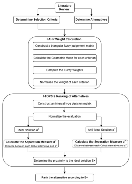 The entire methodology for selecting educational collaboration robots (CoBots) by combining the Fuzzy Analytic Hierarchy Process (FAHP) with the Interval-Type Technique for Order of Preference by Similarity to Ideal Solution (I-TOPSIS) is shown in Figure 1.