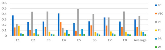 The eight pairwise comparison matrices drawn through the responses from the experts in Table 5 utilized passed or were very close to the Consistency Ratio (CR). Each one was analyzed, and then the overall analysis was conducted.