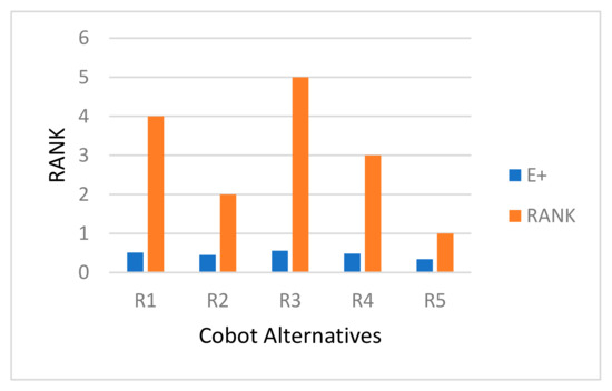 First, the vector normalization method was used to normalize the decision matrix. This guarantees that the various criteria are on a similar scale. The weighted normalized decision matrix was then obtained by multiplying the normalized decision matrix by the weights of the respective criteria. Then, using the maximum and minimum values for each criterion in the weighted normalized choice matrix, the ideal (a+) and negative ideal (a−) solutions are identified. Each alternative’s Euclidean distances, (d+) and (d−), from the ideal solutions are computed. The ratio of the distance from the negative ideal solution to the sum of the distances from the ideal and negative ideal solutions was then used to determine each alternative’s relative proximity to the ideal solution (E+), as indicated in Table 7.