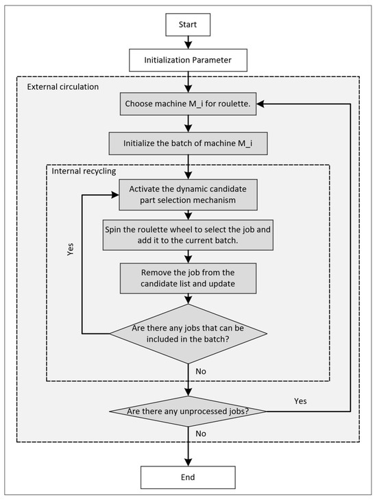 The heuristic injects controllable randomness perturbations through a probabilistic selection mechanism to expand the solution space exploration capability. Firstly, the eigenvalues of machine are determined based on the capacity and processing energy consumption of the machine in Equation (1), and the selection probability of each machine is calculated based on Equation (2). After the target machine is selected using a roulette strategy, an empty batch is initialized when the batch creation condition is met (current machine candidate artifact set is empty). The dynamic candidate artifact filtering mechanism is then activated to filter the set of suitable artifacts to be added to the batch, i.e., the highest prioritized candidate list, based on the current batch status. Finally, taking into account the job information of batch processing time, batch arrival time, delivery time, etc., a roulette strategy is used to select a job to be added to the batch, remove the information of the job that has already been put into the batch and update the candidate list. Repeat the process of job selection and machine selection until all jobs have been dispensed.