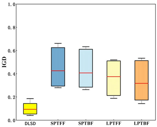 According to the boxplots of Figure 2 and Figure 3, the DLFD heuristic shows remarkable robustness in repeated tests, with consistently high NR (median ≈ 0.8), compact box distribution, and no outliers, which proves that the heuristic is able to output high-quality non-dominated solutions stably at different scales. The IGD values (median ≈ 0.15) are significantly lower than those of the comparison heuristics, with distributional concentration up to more than three times that of the other heuristics, and with an upper value that is still lower than the lower limit of most of the comparison heuristics. This low fluctuation characteristic verifies the high immunity of the heuristic to parameter perturbations and ensures the long-term reliable operation of the actual scheduling scheme.