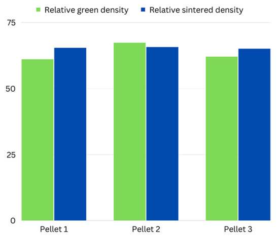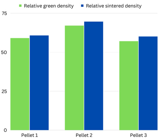 Bar chart of the comparison between green and sintered density at 1600 °C.