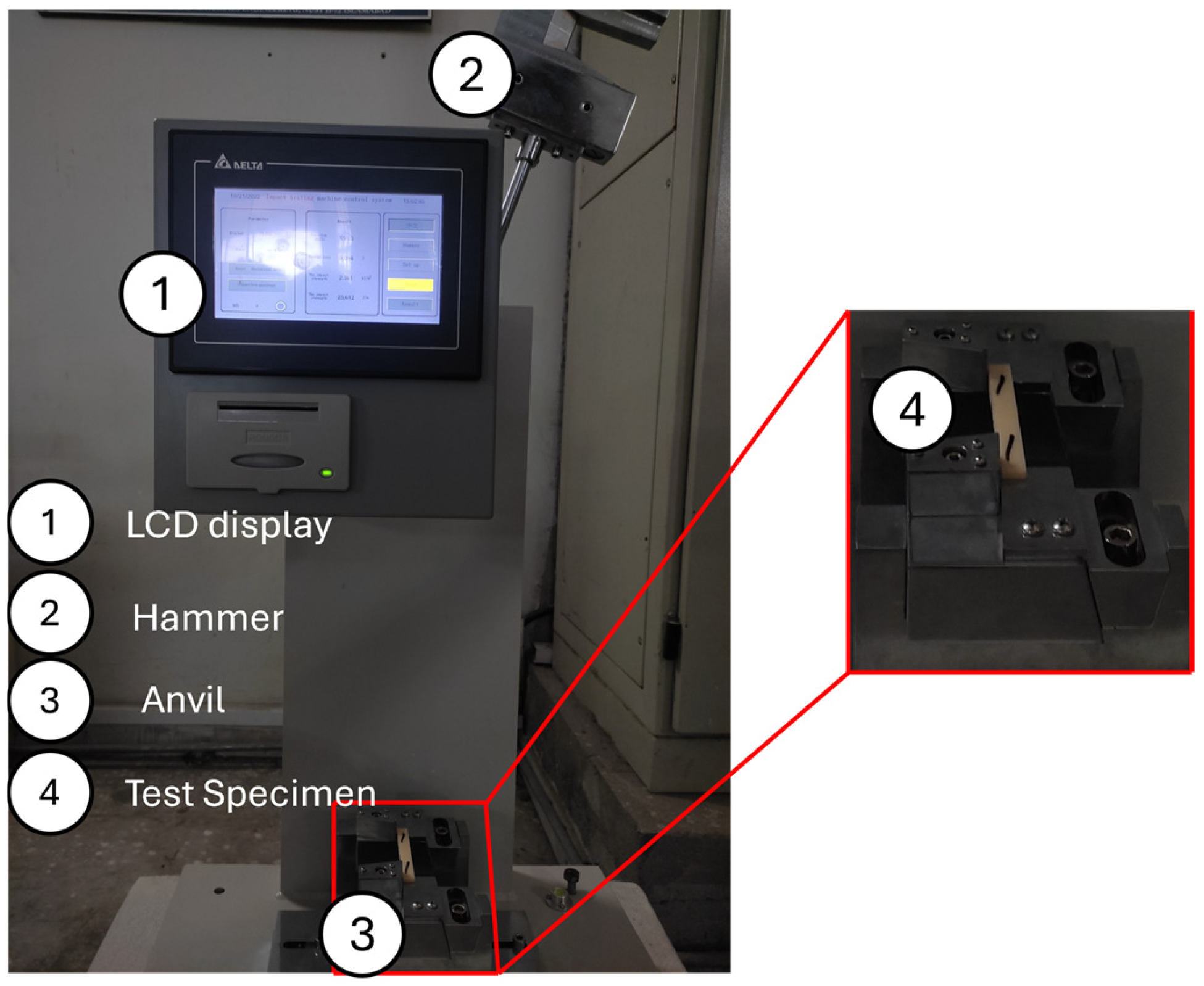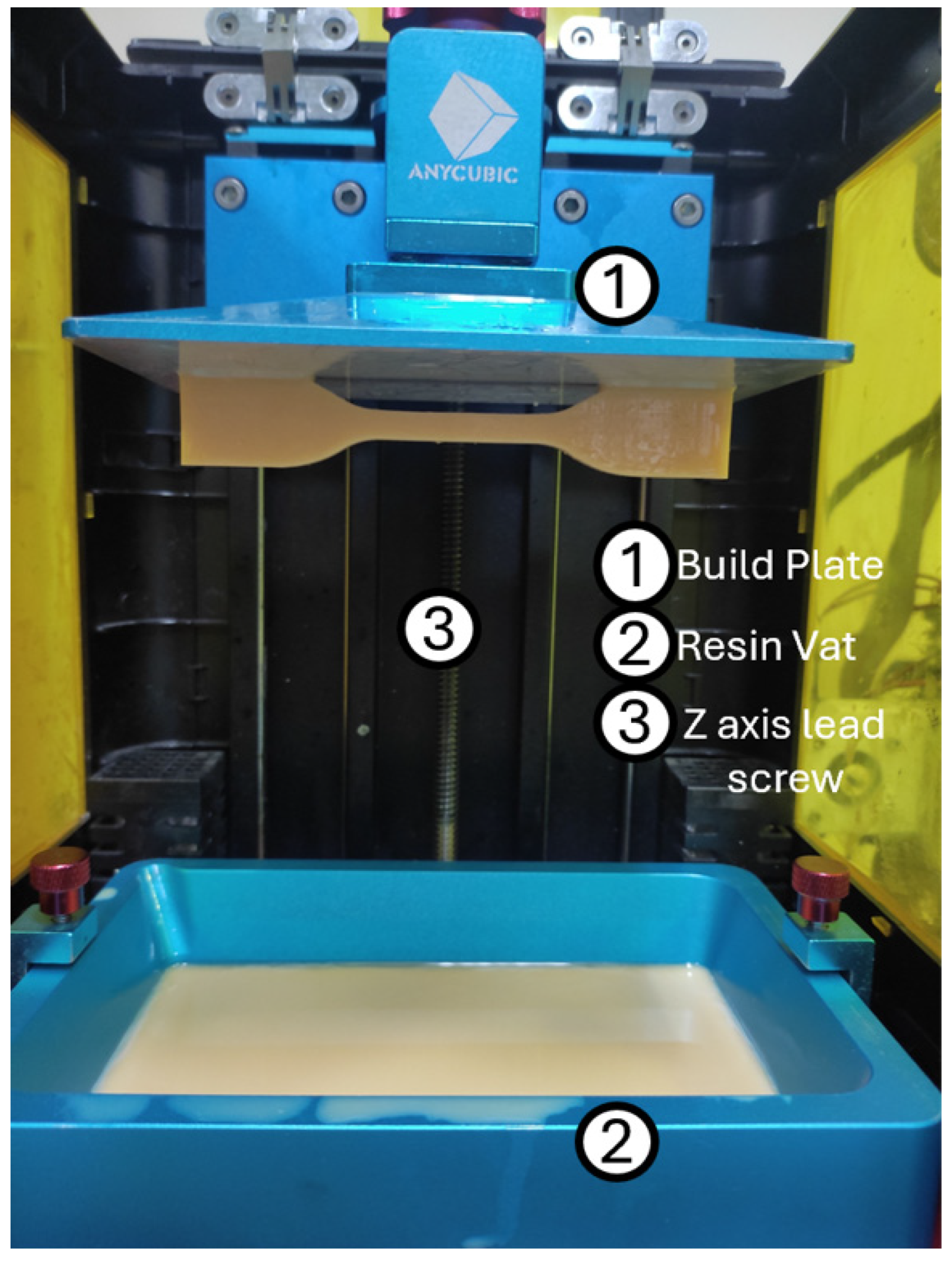 Figure 1, was used to print tensile, flexural, and impact specimens. The printer uses 2K UV light LCDs of 405 nm installed under the vat to selectively polymerize the resin. The base plate of the printer moves upward, allowing resin to be deposited in a successive layer to form 3D objects.