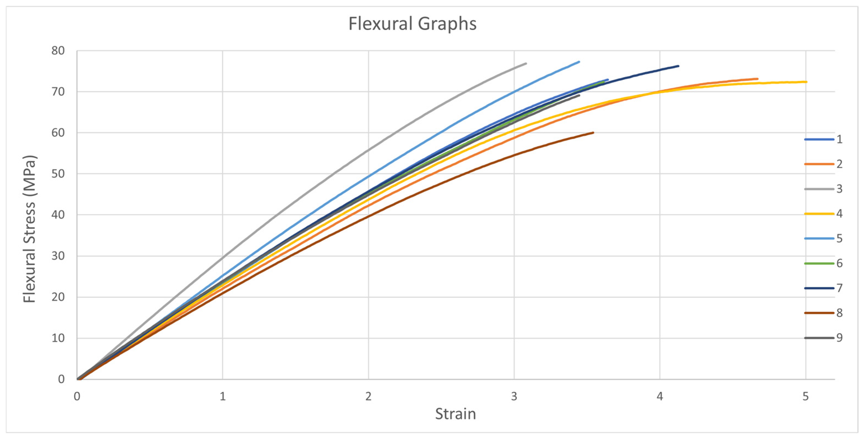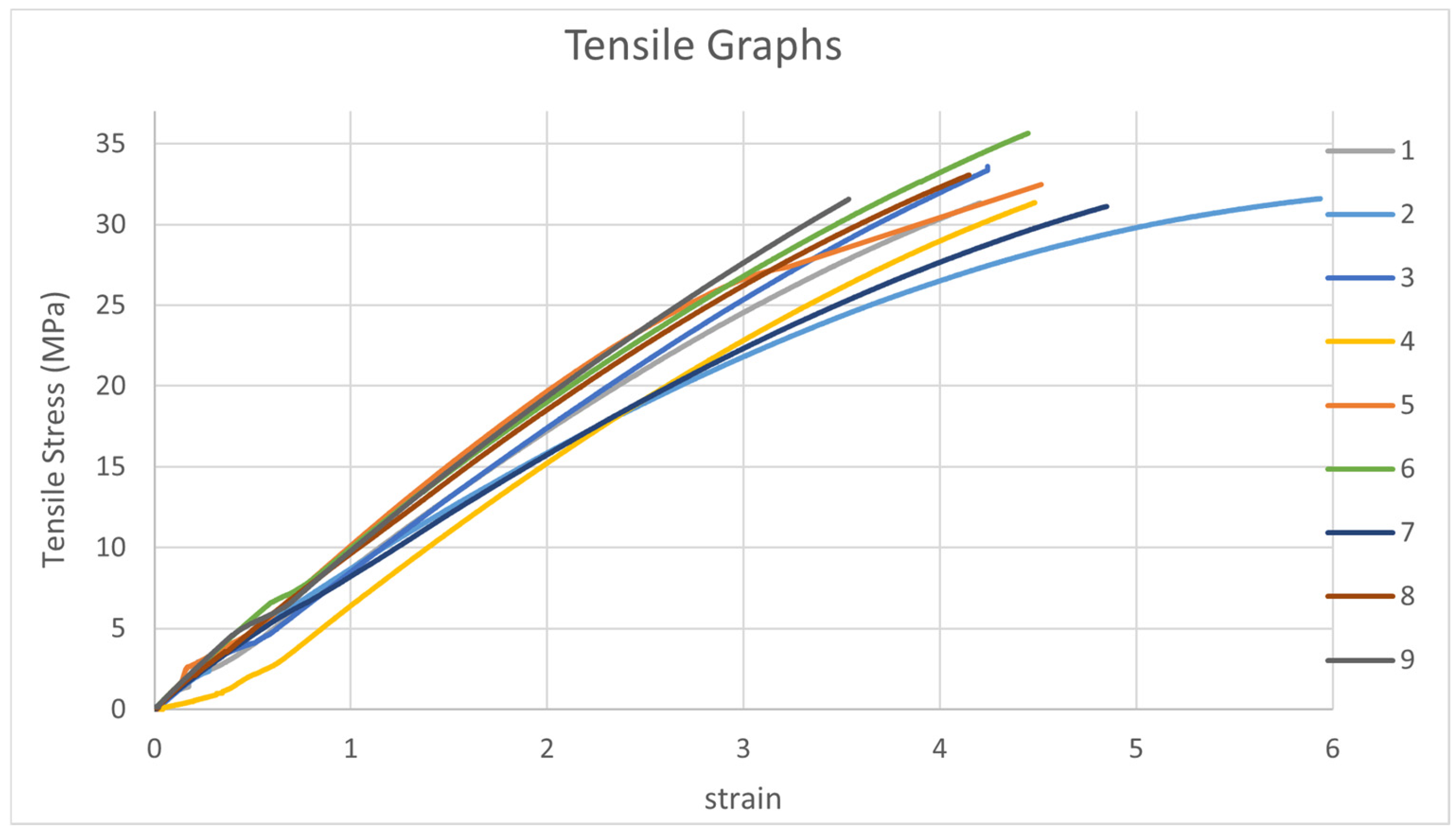 Three specimens for each setting in the L9 orthogonal array were printed at a temperature of 25 Celsius and a relative humidity of 69% for tensile, flexural, and impact studies. All specimens are tested in green conditions. Nine samples, printed with different settings according to the L9 orthogonal array, are shown in