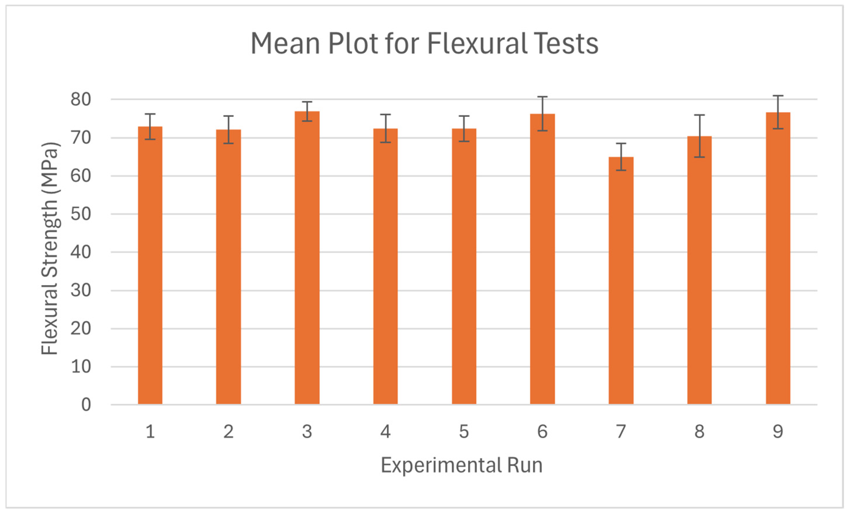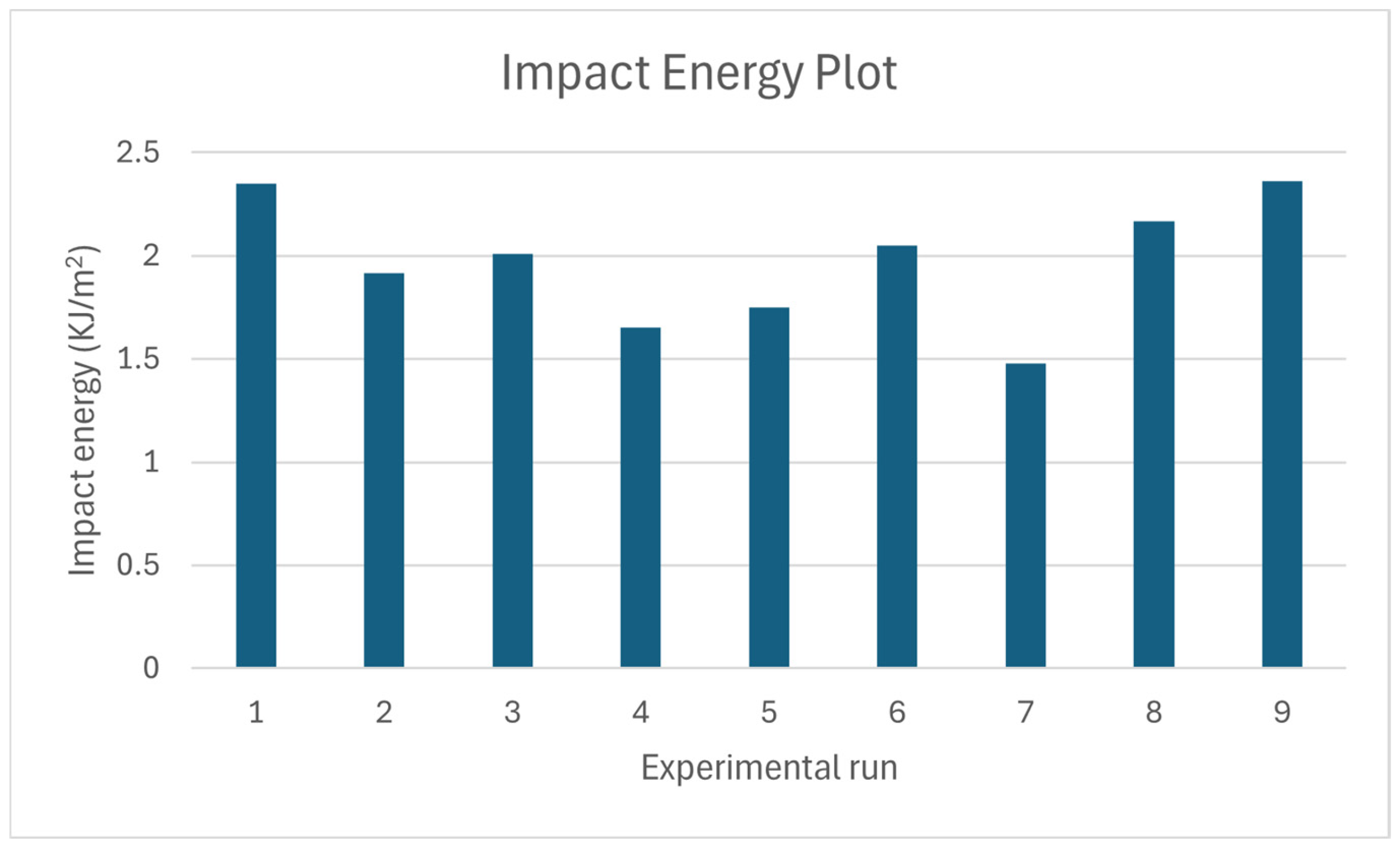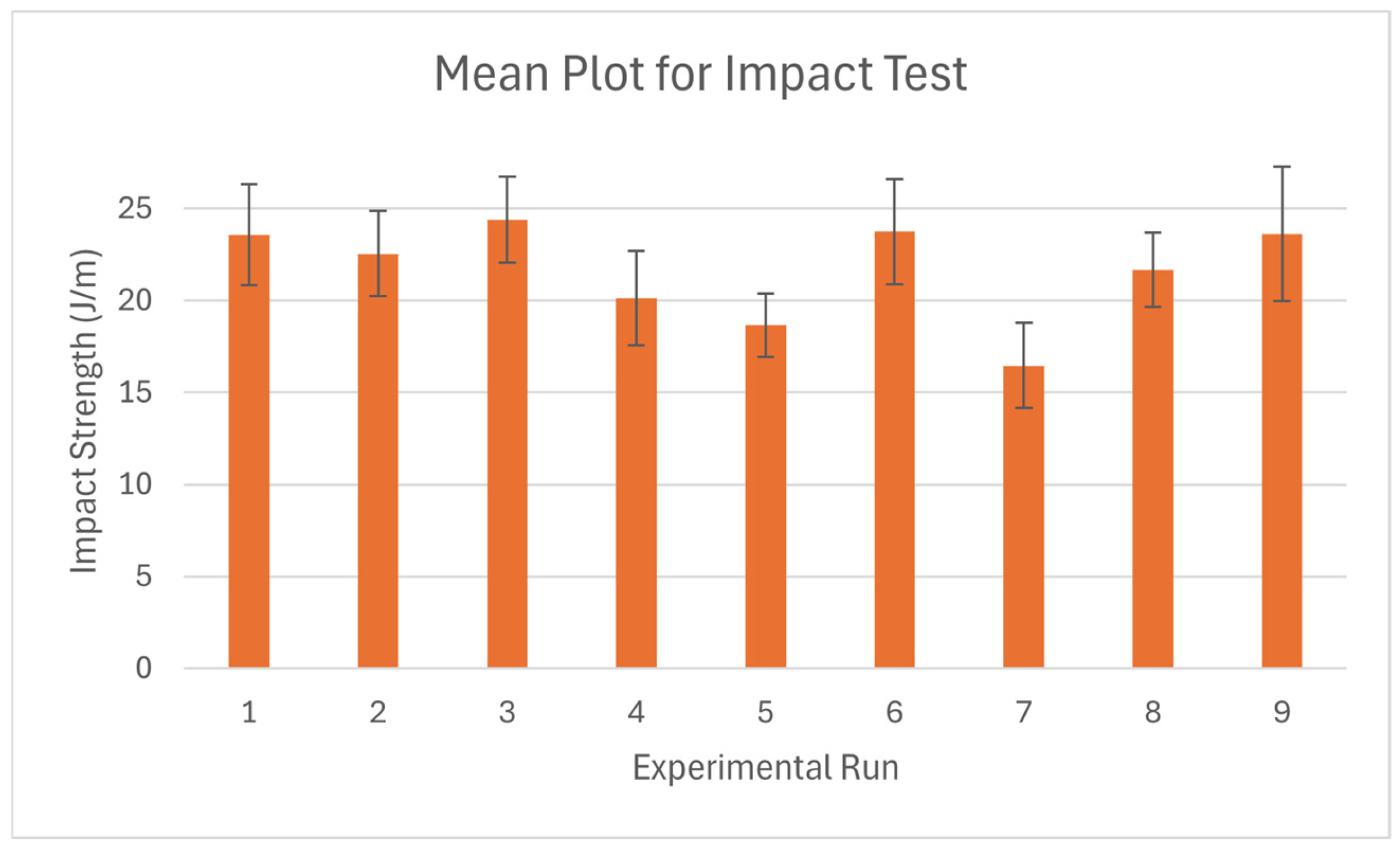 26]. The larger the better was selected as the response variable for mechanical properties, and a regression model was created to establish the relationships between the process parameters and the response variables (tensile, flexural, and impact strength).