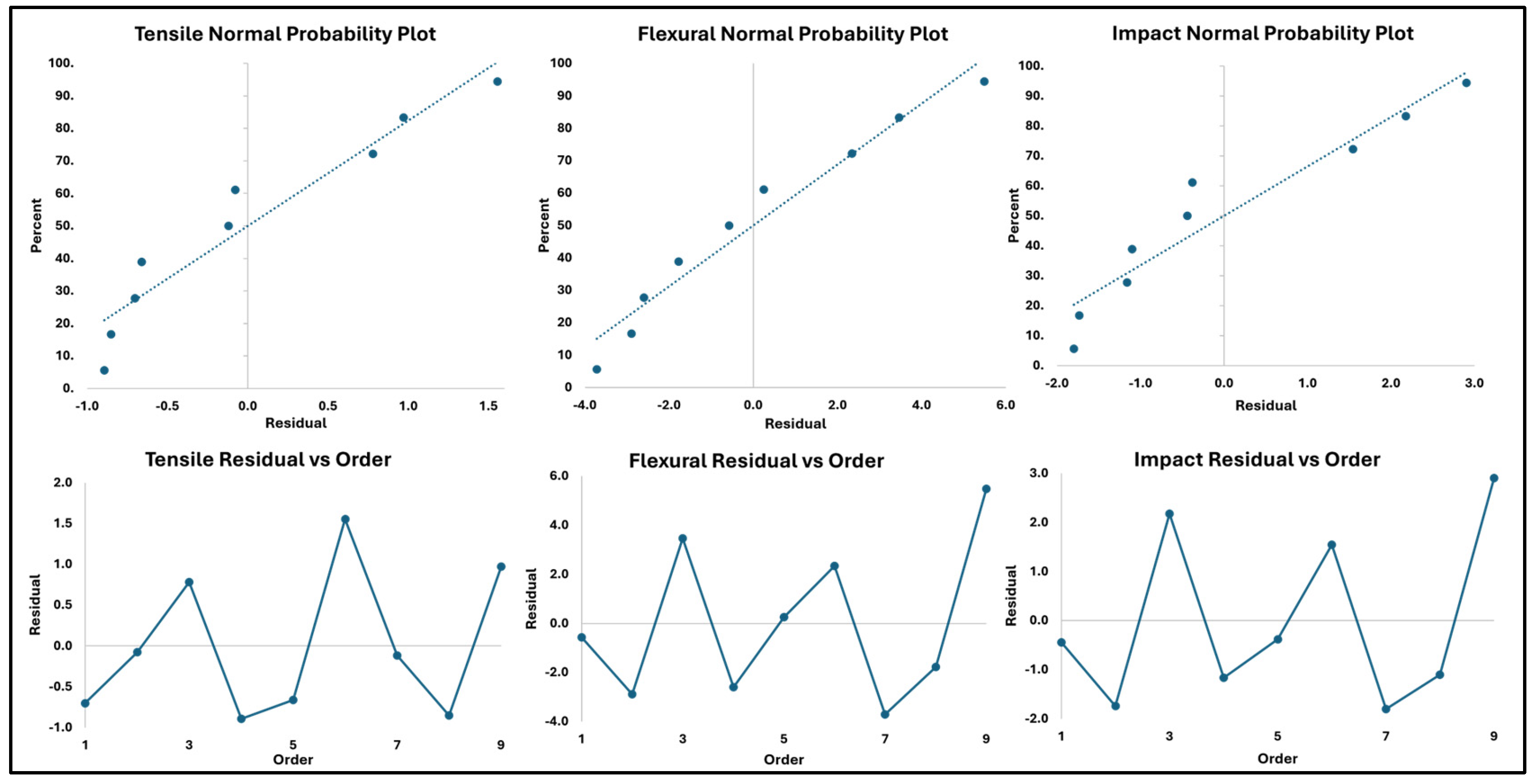 Three regression models as shown in Equations (2)–(4) were created for tensile, flexural, and impact strength, respectively. Since vertical build orientation possesses a maximum contribution to strength, the regression model predicts values for vertical build orientation only. This model helps designers and engineers to predict the part strength before actual experimentation.
