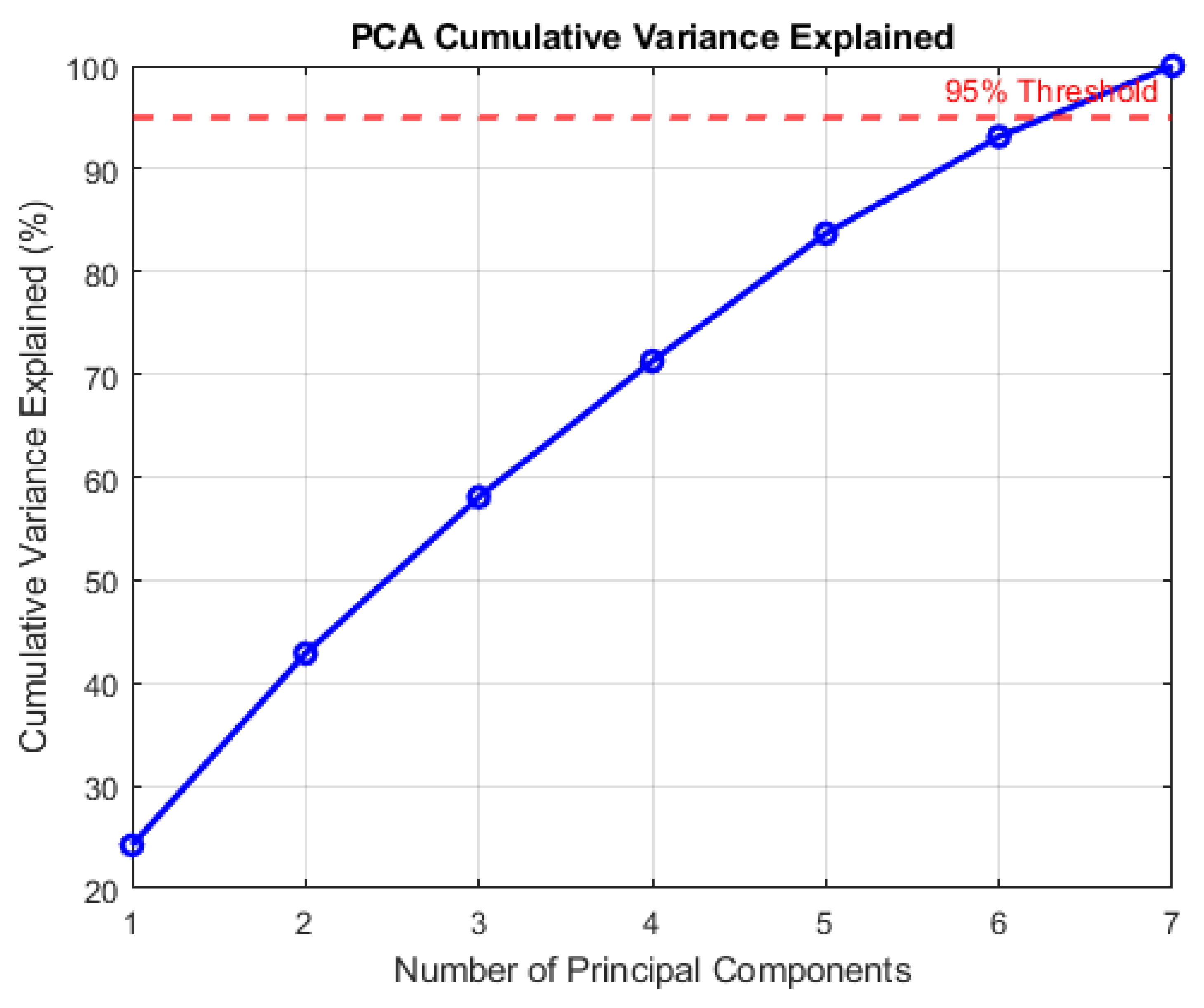 Dimensionality Reduction (PCA): Principal Component Analysis (PCA) is applied to reduce the 150-dimensional input space while preserving at least 95% of the total variance.