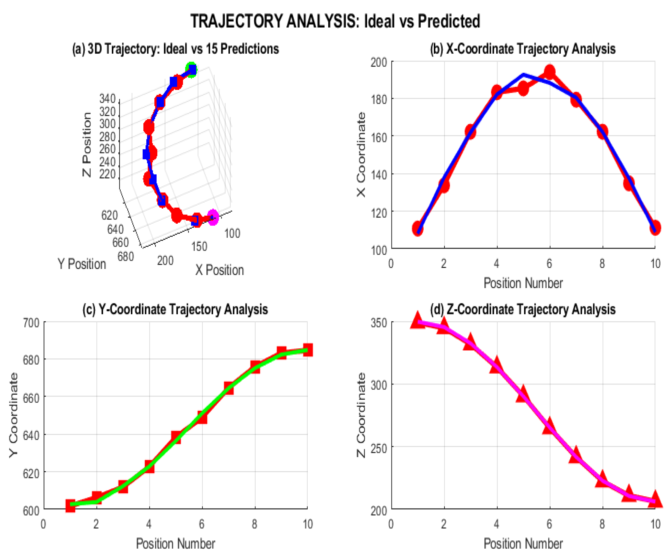 Figure 3a: A 3D trajectory plot indicates that the predicted paths (blue) and the ideal trajectory (red) were closely linked, which validated spatial accuracy by using