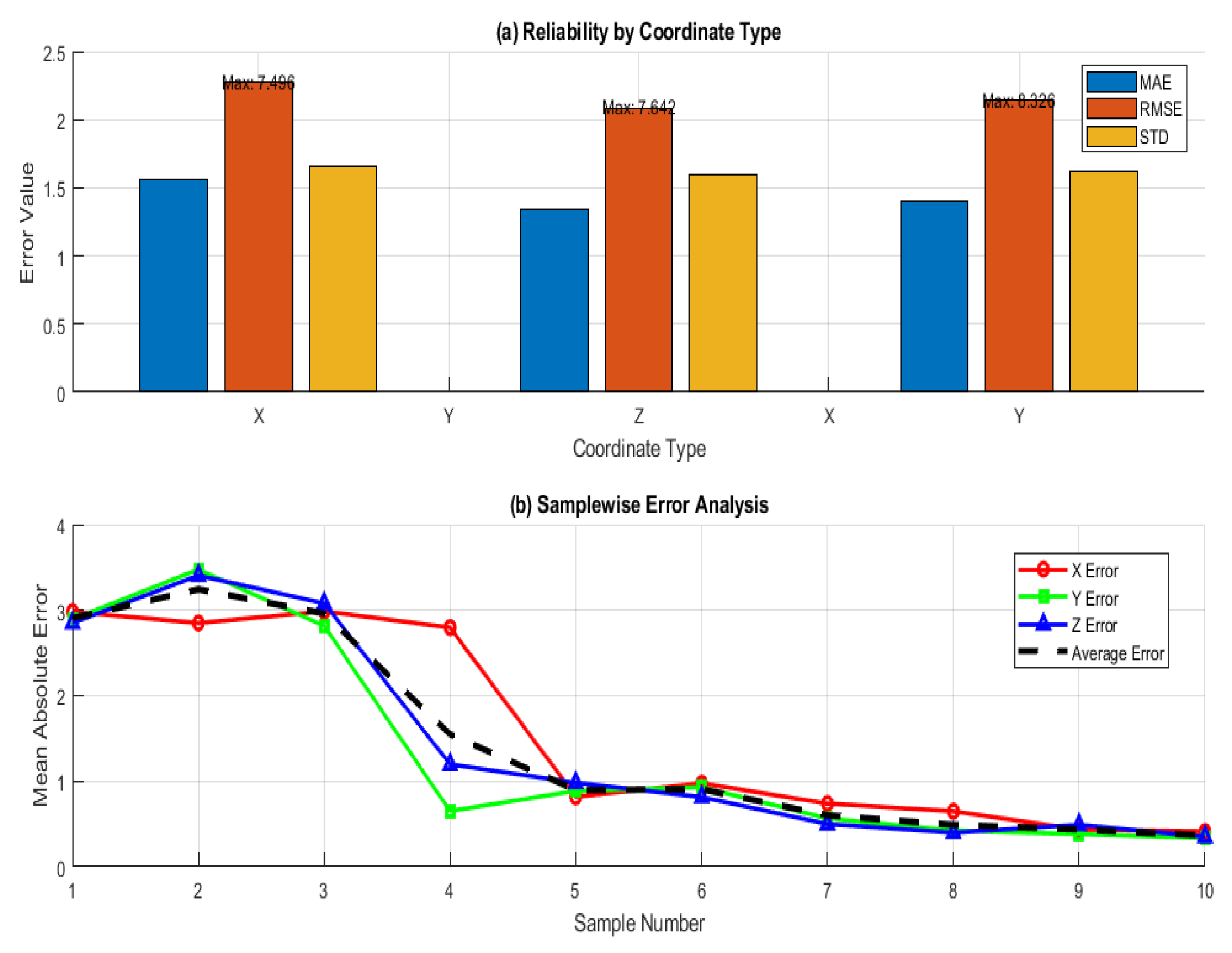 Figure 4a: A grouped bar chart compares MAE, RMSE, and STD for the X, Y, and Z coordinates. The X- and Z-axes exhibit slightly higher RMSE than Y, but all errors remain under acceptable bounds (below ~2.5 mm). This indicates balanced performance across dimensions.