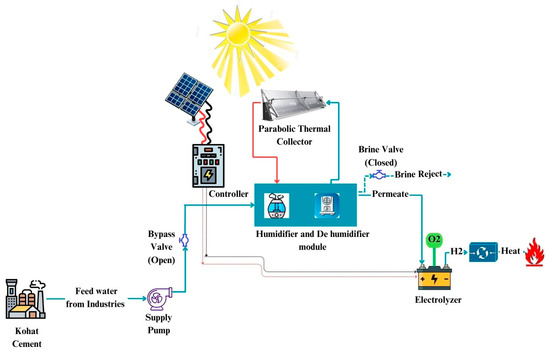 The proposed system combines wastewater treatment with renewable hydrogen production, powered entirely by solar energy. The process begins with wastewater being pumped into a desalination unit operating on the humidification–dehumidification (HDH) principle. As shown in Figure 1, the wastewater is first pre-heated by incoming hot air in the dehumidifier, then further heated in a parabolic trough solar collector. This heated water is then sprayed into the humidifier, where it increases the humidity of the air. Brine is discharged from this step, while the now-humidified air is sent to the dehumidifier, where a temperature differential causes condensation. The resulting condensate, called permeate, is clean water.