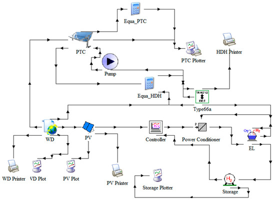 The simulation ran over a full calendar year with a 15-min time step to account for transient behavior and seasonal variation. Validation was performed by comparing component performance with manufacturer data. A simplifying assumption was made by maintaining a constant air humidity ratio of 100% in the HDH process to reduce model complexity. Primary outputs analyzed included solar power generation, hydrogen yield, and overall system efficiency. Monitoring tools such as online plotters (Type 65d) and data printers (Type 25c) were used to track outputs at key nodes in the system.