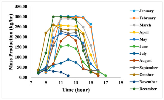 The variation in clean water production throughout the day across the whole year is shown in Figure 3. The system demonstrates a clear production peak between 10:00 AM and 1:00 PM, followed by a steep decline in the afternoon. Notably, the highest production rates occur during cooler, low-humidity periods, reaching up to 300 kg/h for 4000 kg/day of wastewater supply. In contrast, hot and humid conditions result in significantly lower water output.