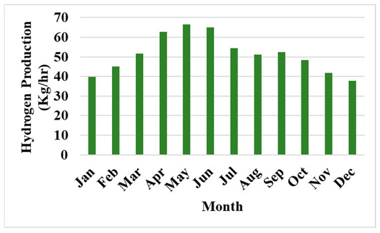 The hydrogen production data shown in Figure 4 reveals clear seasonal trends, with the highest production occurring in May at 66.5 kg/h, and the lowest in December at 37.9 kg/h. The May data coincides with a period of low voltage but high current, which, coupled with the increased efficiency of the electrolyzer during this time, leads to greater hydrogen output. In contrast, the December data is characterized by high voltage and lower current, which results in reduced hydrogen production, despite the high voltage. This highlights the significant influence of voltage and current variations on the overall hydrogen production efficiency throughout the year.
