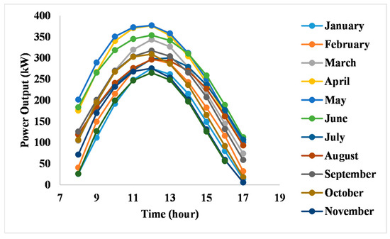 The power output of the solar PV system throughout the day follows a typical daily cycle, as shown in Figure 5. Power levels rise in the morning, peak around noon, and then decrease rapidly in the late afternoon. The highest power output occurs in May, reaching a peak of 377 kW at noon, while the lowest output of 265 kW is recorded in December at the same time. This variation is directly linked to solar radiation, which is stronger during the summer months and weaker in the winter, resulting in reduced power generation.