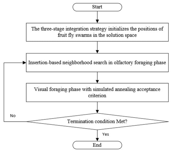 Due to the complex combinatorial structure and multi-objective conflicts inherent in hybrid flow shop scheduling problems with unrelated parallel machines (HFSPs), the solution space exhibits exponential growth. To address the optimization objectives of this multi-objective problem, an improved Fruit Fly Optimization Algorithm integrating a three-stage integration strategy and simulated annealing (SA-FOA) is proposed. Compared to the basic FOA, SA-FOA employs a hybrid initialization strategy to generate high-quality initial solutions. In the olfactory search phase, the algorithm explores new regions via insertion-based neighborhood searches, and the visual search phase employs simulated annealing to avoid getting stuck in local optima. The flowchart of the proposed SA-FOA is illustrated in Figure 1.