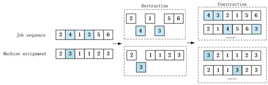 During the destruction phase, several jobs are randomly picked and taken out of the current sequence. After that, during reconstruction, these removed jobs are placed back one by one into all possible positions within the partial sequence, following the order in which they were removed. The goal is to rebuild a full job sequence that leads to the shortest possible total completion time. Simultaneously, a mild perturbation mechanism is introduced to the machine assignment: with a 30% probability, the machine allocation for a randomly selected job–operation pair is exchanged with another job’s assignment on the same operation. This joint operation simultaneously modifies both the job sequence and machine configuration, as the machine swap not only alters the processing order of jobs but also adjusts their machining times and subsequent scheduling outcomes, thereby optimizing the overall solution.