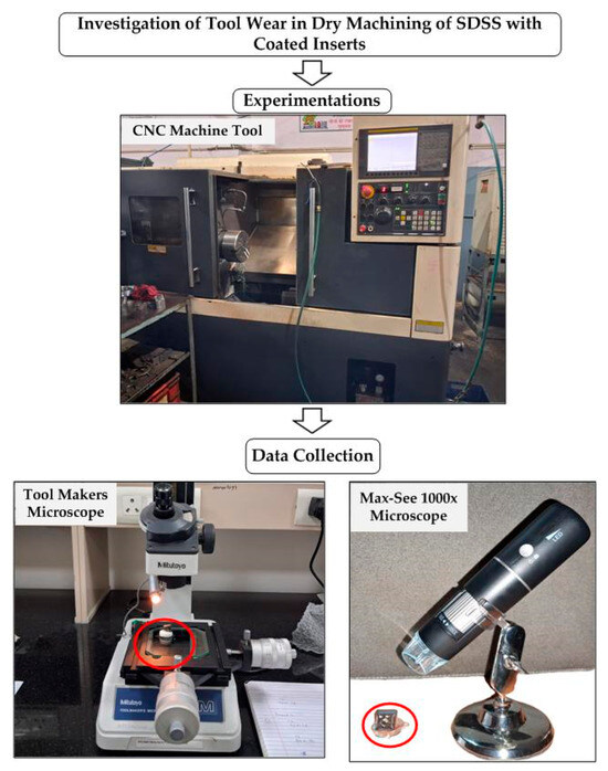 The experiments were conducted on SDSS grade 2507 using PVD-TiAlN-coated inserts of grade CNMG 120408 45 DP5010 on an Ace Micromatic Super Jobber 500 CNC machine tool. The tool holder of ISO grade MCLNL 2525 M12 was used to hold the cutting inserts. The critical machining factors, such as cutting speed (75–125 m/min), feed rate (0.04–0.18 mm/rev), and depth of cut (0.4–1.2 mm), were varied throughout the trials using the Taguchi L