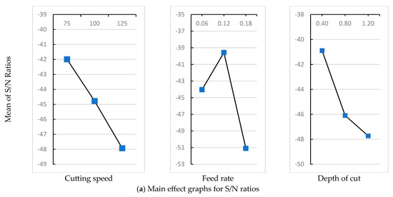 Figure 3 illustrates how the machining parameters affect flank wear, providing a detailed analysis of both the mean values and signal-to-noise (S/N) ratios.