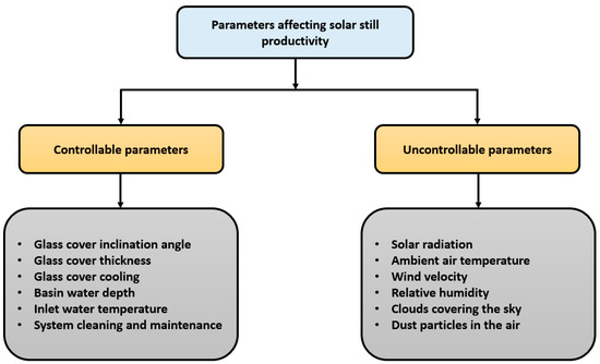 The parameters affecting solar still output can be categorized into two types: controllable parameters and uncontrollable parameters [17]. Details on these parameters are shown in Figure 1.