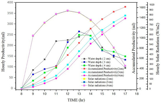 The rate of evaporation increases with a decrease in water depth due to an increase in the basin water temperature. At a lower water depth level, the solar energy is more efficiently absorbed by the water as compared to with a large volume of water. The maximum productivity for each water depth was observed between 12 and 2 pm. It can be easily observed from Figure 4 that the solar radiation remained almost the same throughout the observation period in each case.