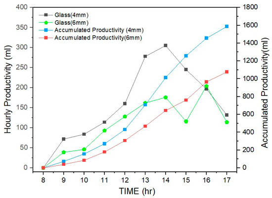 The trend of hourly productivity can be seen in Figure 5. The total distillate output when using the 4 mm and the 6 mm glass cover was 1587 mL and 1078 mL. The productivity of the solar still with the 4 mm glass cover was 32% higher than that of the solar still with the 6 mm glass cover. The 4 mm glass has higher solar transmittance as compared to the 6 mm glass, which allows the more solar radiation to reach the water surface and consequently increases the rate of evaporation.