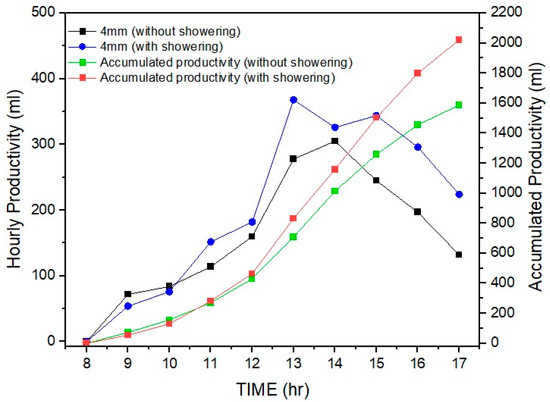 This experimental study revealed that cooling down the glass surface increases the condensation rate, and as a result, productivity is enhanced. The hourly and accumulated output of the solar still (with and without showering) is shown in Figure 6.