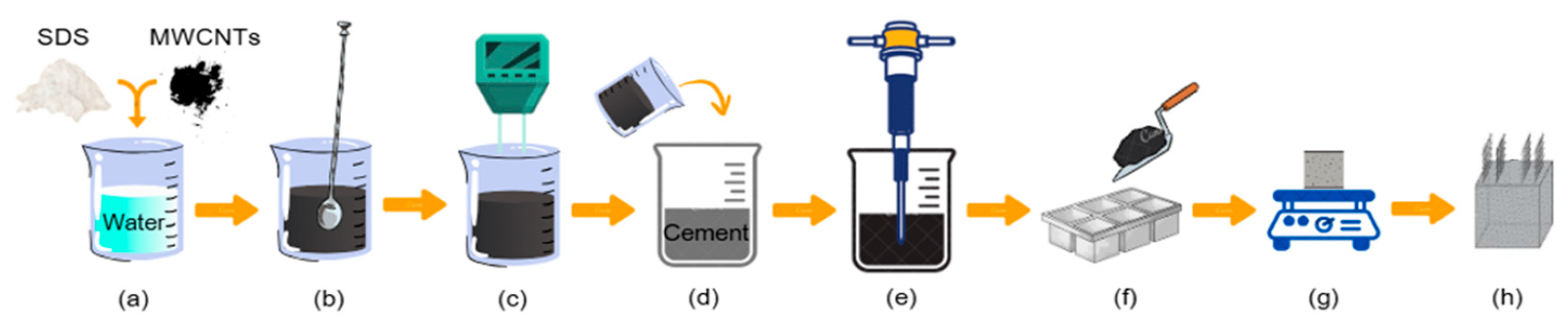 Figure 1. Preparation procedure of cementitious pastes with MWCNTs: (a) addition of MWCNTs and surfactant to water; (b) mechanical stirring; (c) sonication; (d) addition of MWCNT suspension to the cement powder; (e) mechanical mixing; (f) molds casting; (g) vibration; (h) embedding of copper electrodes.