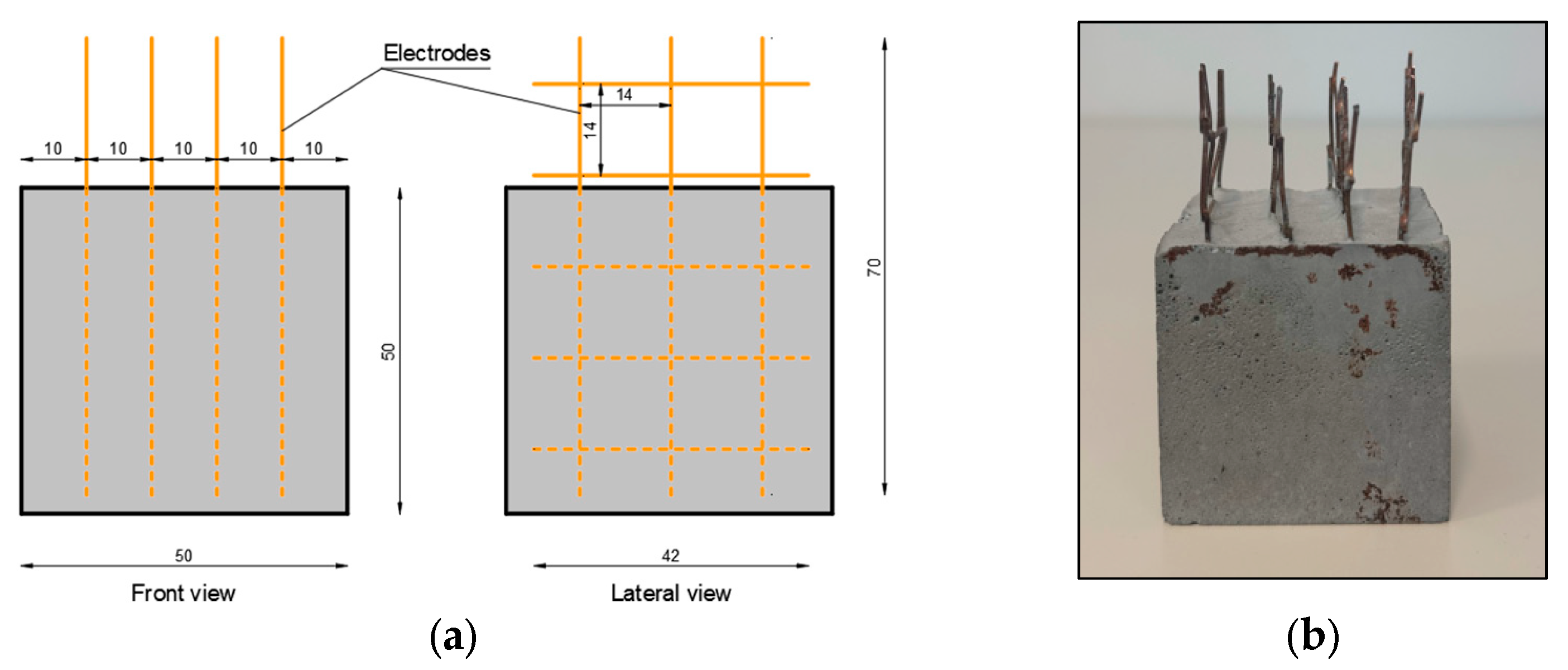 Figure 2. (a) Geometry of specimens and electrodes (dimensions are in mm). (b) Sample after the curing period.