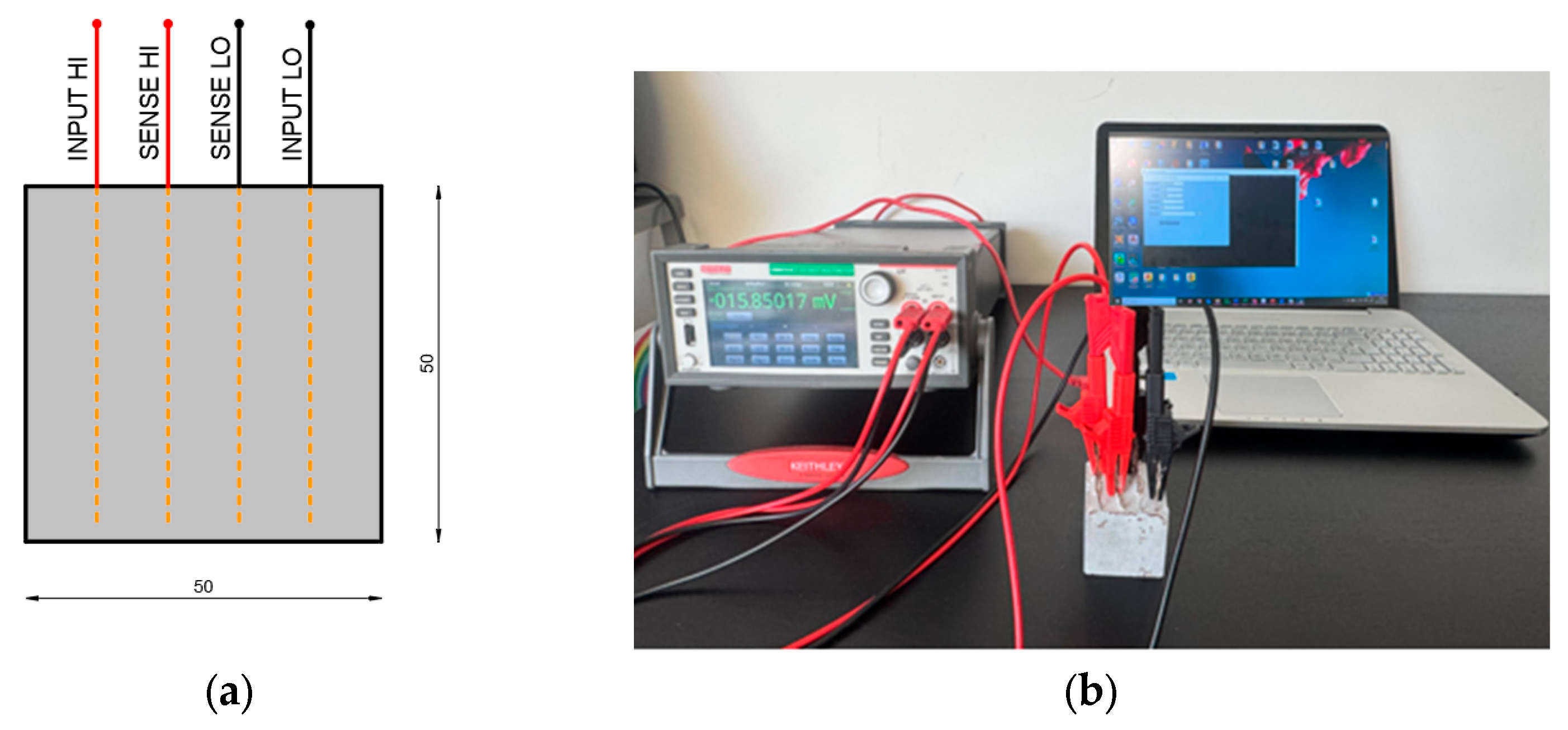 Figure 3. (a) Connection of test cables to sample electrodes (dimensions are in mm). (b) Test setup for electric resistance acquisition.