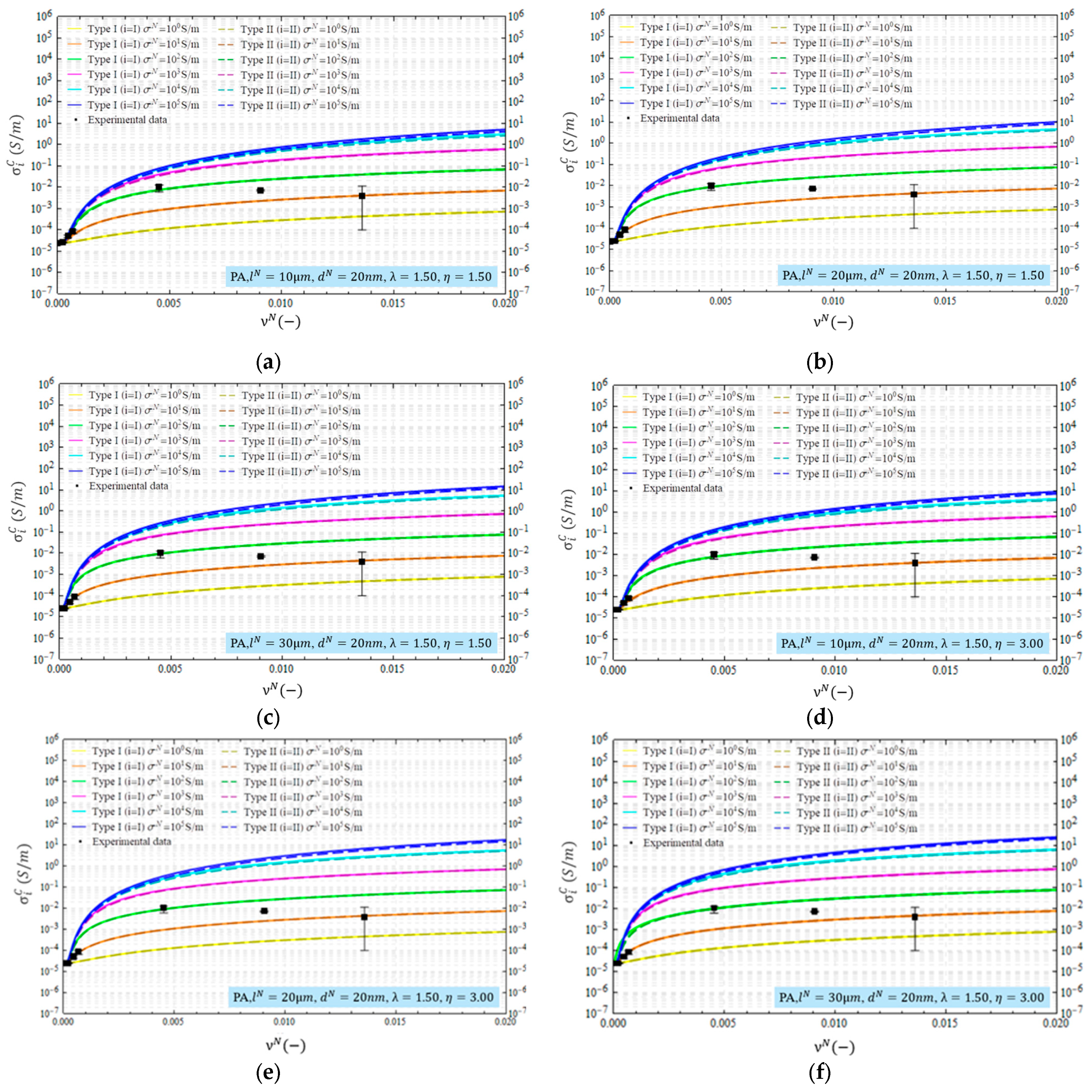 Figure 5. Comparison between micromechanical model predictions and experimental results of electrical conductivity of MWCNTs cement–matrix composites for different geometry parameter and η values: (a) l N = 10   μ m ,   d N = 20   n m ,   λ = 1.50 ,   η = 1.50 ; (b) l N = 20   μ m ,   d N = 20   n m ,   λ = 1.50 ,   η = 1.50 ; (c) l N = 30   μ m ,   d N = 20   n m ,   λ = 1.50 ,   η = 1.50 ; (d) l N = 10   μ m ,   d N = 20   n m ,   λ = 1.50 ,   η = 3.00 ; (e)   l N = 20   μ m ,   d N = 20   n m ,   λ = 1.50 ,   η = 3.00 ; (f) l N = 30   μ m ,   d N = 20   n m ,   λ = 1.50 ,   η = 3.00 .