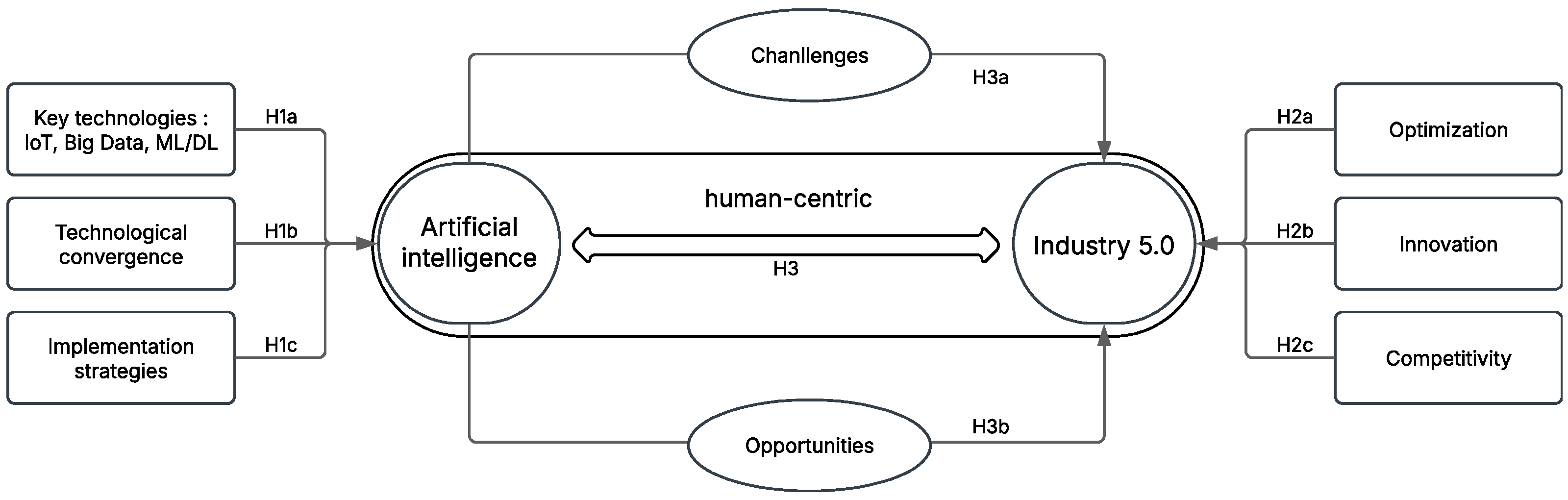 Figure 1) outlines the bidirectional interaction between Artificial Intelligence (AI) and Industry 5.0, where their connection is significantly mediated through a core human-centric lens (H3), linking key technologies like IoT, Big Data, Machine Learning, and Deep Learning (H1a) to Industry 5.0’s human–machine collaboration (H1a–H3). Through technological convergence (H1b) and strategic implementation (H1c), AI addresses challenges such as organizational resistance and skill gaps (H3a) while unlocking opportunities (H3b) like process optimization, innovation, and competitiveness (H2a–H2c). This evolution toward Industry 5.0 focuses on innovation, customized production, surpassing the efficiency-centric model of conventional industry, with AI enabling automation (e.g., predictive maintenance, supply chain optimization) and fostering human–machine synergy, as seen in Tesla’s use of cobots for precision and safety (H2b). As illustrated in