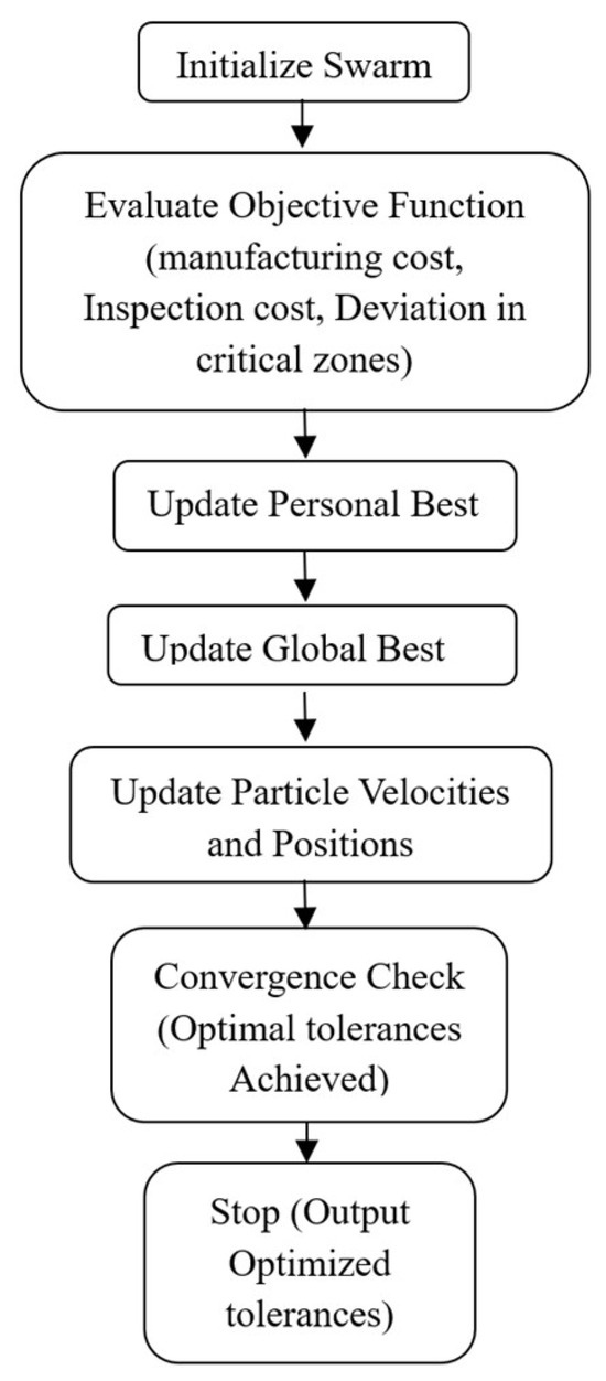 Figure 1 illustrates the PSO process for tolerance optimization. It begins with the initialization of a swarm of particles, each representing a potential solution. The particles are evaluated based on a cost function that includes manufacturing and inspection costs and deviations in critical zones. Personal and global bests are updated iteratively, guiding the swarm toward optimal solutions through velocity and position updates. The process repeats until the convergence criteria are met, producing optimized tolerances that balance precision, cost, and functionality. This flowchart highlights the structured approach PSO employs to efficiently solve the complex problem of tolerance optimization.
