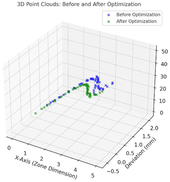 Figure 3 plot visualizes the point clouds for the turbine blade before and after optimization. The blue points represent the original deviations captured in the inspection process, while the green points show the optimized deviations after applying the tolerance optimization process. The reduction in deviations demonstrates improved precision, particularly in critical zones, while maintaining efficiency in non-critical areas. This visualization highlights the effectiveness of the optimization in aligning the blade’s geometry with design specifications.