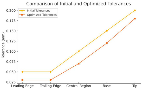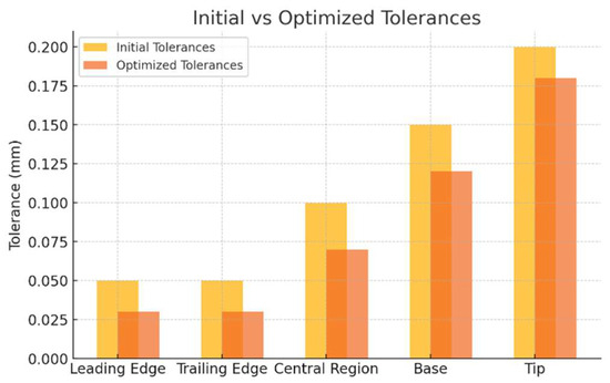 According to Figure 7. The optimization process led to a clear reduction in tolerances across all zones of the blade. Critical areas, like the leading and trailing edges, saw tighter tolerances, enhancing functionality and aerodynamic performance, while non-critical zones had relaxed tolerances to reduce costs and inspection time. This approach improved precision and efficiency, but further validation is needed to ensure that relaxed tolerances in non-critical zones do not compromise long-term structural integrity.