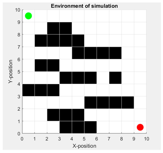 In this section, we compare two approaches: Q-learning with static hyperparameters and Q-learning with dynamic hyperparameters. For both of them, we simulate the algorithm by including noise of sensors to evaluate the impact and relationship between sensors that represent the external environment and hyperparameters for the learning of the agent. Our environment is represented in Figure 3, where the starting point is the agent (robot) marked in green, the goal to reach is marked in red, and the obstacles to avoid are the back walls. And Table 2 represents the quantitative complexity of environment.