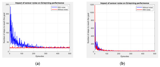 In both cases, the sensor noise hinders the agent’s ability to quickly converge towards the goal. The noise increases the number of steps necessary to achieve the objective, demonstrating that the sound of the sensor introduces a significant uncertainty which must be managed in the applications of the world of Q-learning.