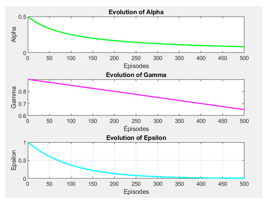 Figure 4b shows results where the agent learns through Q-learning but this time with dynamic learning parameters, namely alpha, gamma, and epsilon, which change over time. The initial values for alpha, gamma, and epsilon are higher and decay over episodes, as shown in Figure 5: