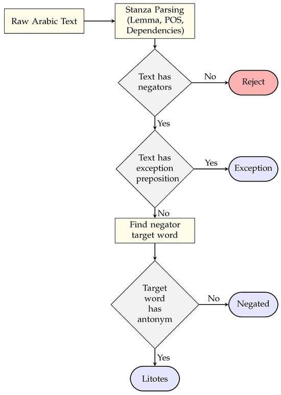 (except), which often signal exception-based meanings. If such an exception word is found in proximity to the negated segment, the sentence is labeled as exception. When no exception is found, the system attempts to identify the syntactic target of the negator. This involves tracing dependency links to determine which word (typically an adjective) is being negated. The identified token becomes the focal point for subsequent semantic checks, particularly antonym lookup. For this task, we used Arabic WordNet. Once the target word of the negation has been identified, the system queries Arabic WordNet to determine whether the word has a known antonym. This step is crucial for detecting litotic constructions, where negation combined with a semantically opposite term conveys intensified meaning. If an antonym is found, the sentence is labeled as litotes; otherwise, the label defaults to negated.