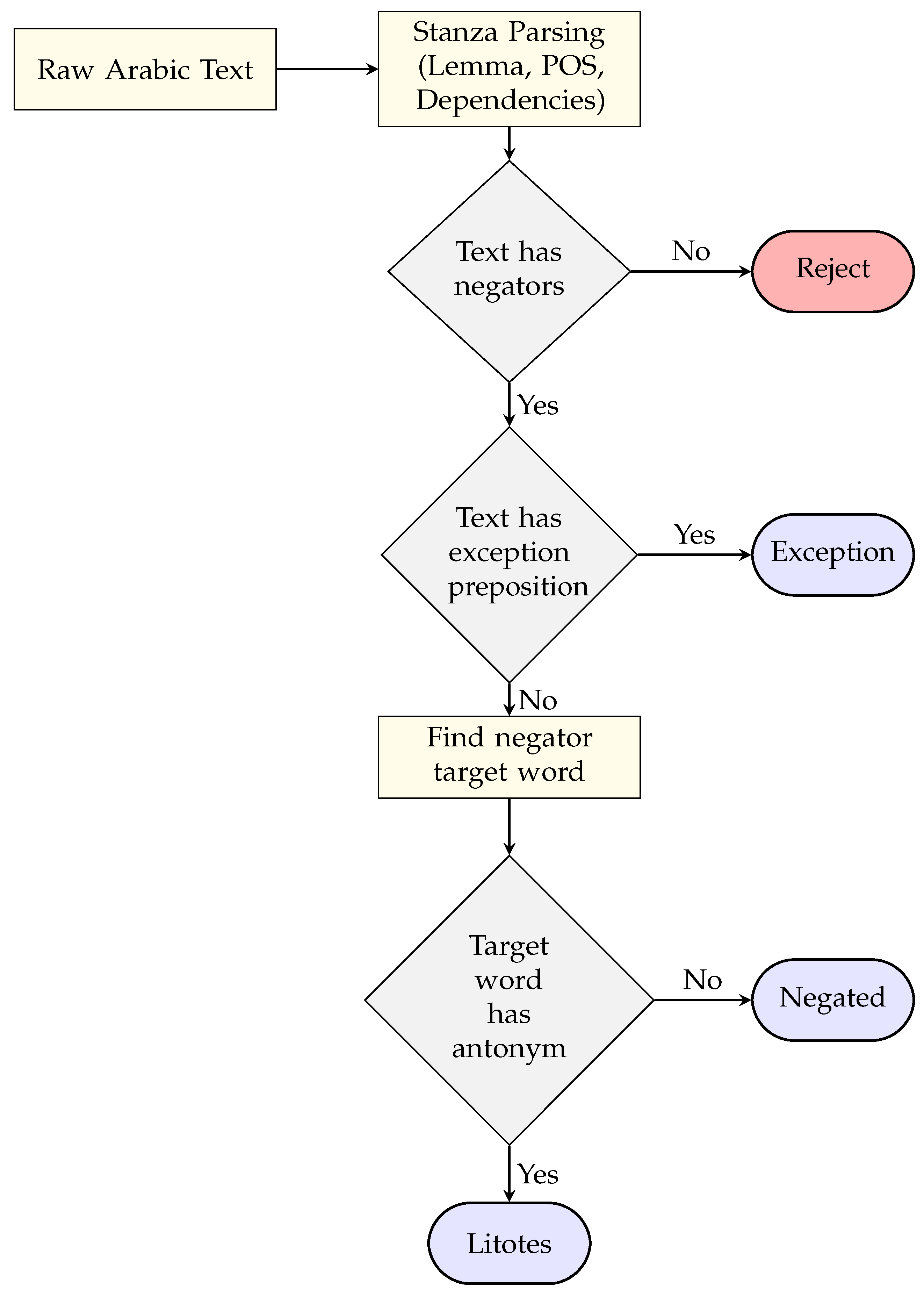 exception. When no exception is found, the system attempts to identify the syntactic target of the negator. This involves tracing dependency links to determine which word (typically an adjective) is being negated. The identified token becomes the focal point for subsequent semantic checks, particularly antonym lookup. For this task, we used Arabic WordNet. Once the target word of the negation has been identified, the system queries Arabic WordNet to determine whether the word has a known antonym. This step is crucial for detecting litotic constructions, where negation combined with a semantically opposite term conveys intensified meaning. If an antonym is found, the sentence is labeled as