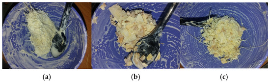 Next, mixtures of fibers and PVAC [7] were prepared in the specified ratios: 80% PVAC and 20% Alfa for the Alfa sample, 60% PVAC and 40% Wood for the Wood sample, and 60% PVAC, 20% Wood, and 20% Alfa for the Alfa-Wood sample. These mixtures (Figure 2a–c) were thoroughly blended and then poured into a plastic mold with a diameter of 50 mm, which was constructed using a plastic tube attached to a silicone base layer. The mixture was manually pressed to ensure uniformity and proper compaction.