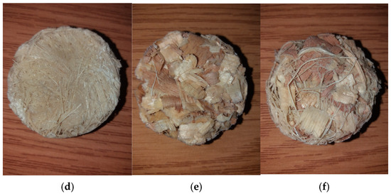 (a) 80% PVAC and 20% Alfa mixture; (b) 60% PVAC and 40% Wood mixture; (c) 60% PVAC, 20% Wood, and 20% Alfa mixture; (d) 80% PVAC and 20% Alfa sample; (e) 60% PVAC and 40% Wood sample; (f) 60% PVAC,20% Wood, and 20% Alfa sample.