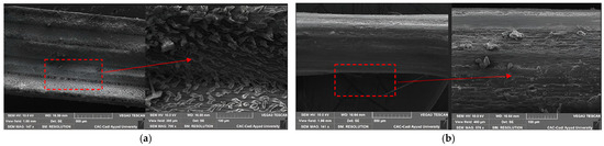 Scanning electron microscopy (SEM) hirox (Tokyo, Japan) was employed to analyze the morphology of alfa fibers, comparing untreated and alkali-treated samples. The alkali treatment, likely using sodium hydroxide, induced significant structural changes in the fibers. Untreated fibers exhibited a smooth surface, a characteristic attributed to the presence of non-cellulosic components such as lignin and hemicellulose (Figure 3a). In contrast, treated fibers displayed a rougher surface due to the removal of these non-cellulosic materials (Figure 3b), which plays an important role in enhancing interfacial bonding with polymer matrices in composite applications. This increased surface roughness provides more contact points for adhesion, improving the mechanical properties of the resulting composites. Additionally, a notable decrease in fiber diameter from 1.66 mm in untreated fibers to 0.4 mm in treated samples further confirms the effective removal of lignin and hemicellulose, resulting in a purer cellulose structure [4]. The zoomed views revealed micropores and microfibrils in untreated fibers, which are associated with the presence of hemicellulose and lignin. These microfibrils were largely absent in treated fibers, underscoring the chemical efficacy of the alkali treatment. These morphological changes, including increased surface roughness, reduced fiber diameter, and the absence of microfibrils, collectively contribute to improved tensile strength, stiffness, and overall performance of the fibers in reinforced composites.