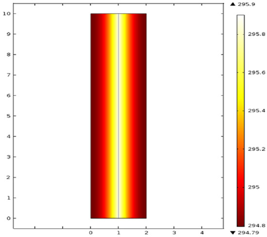 Figure 5 illustrates the transient temperature distribution within a cylindrical domain, simulated using COMSOL Multiphysics. The study employs the time-dependent heat conduction equation, numerically solved through the finite element method (FEM). The computational domain is discretized into a limited number of finite elements, allowing for the temperature at each node to be computed as a function of time. The resulting temperature field shows a symmetric heat diffusion pattern, with the highest temperatures (around 295.9 K) concentrated along the central axis of the cylinder, gradually decreasing toward the outer edges, where the lowest temperature reaches approximately 294.8 K. This gradient highlights the effect of internal heat generation or an imposed boundary condition leading to a temperature peak at the core [10,11].