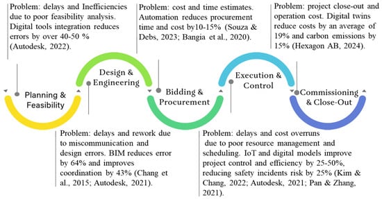 Inefficiencies and the Impact of Digital Technologies Across Project Phases. (References: Souza & Debs, 2023 [5]; Autodesk, 2022 [13]; Bangia et al., 2020 [14]; Hexagon AB, 2024 [15]; Chang et al., 2015 [16]; Autodesk, 2021 [17]; Kim & Chang, 2022 [18]; Autodesk, 2021 [19]; Pan & Zhang, 2021 [20]).