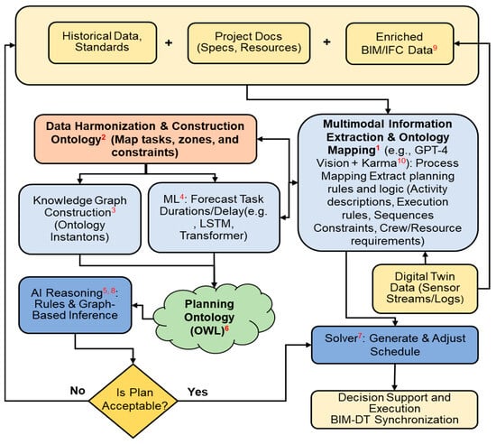 Rule-based reasoning validates the logic of generated plans by enforcing domain constraints encoded in the ontology (Section 2.4), such as precedence, spatial allocation, and resource constraints. In parallel, graph-based reasoning using logic traversal over ontology structures evaluates plan feasibility, identifies inconsistencies, and supports knowledge inference across interconnected scheduling entities. These reasoning processes interact with the harmonized knowledge base of enriched BIM and DT data. The harmonized ontology not only defines the semantic structure of the framework but also operates as a dynamic knowledge graph. This knowledge graph comprises instantiated entities (e.g., construction activities, resources, constraints, spatial zones) and their interrelationships derived from BIM, DT, and multimodal AI-extracted data. As a result, AI models can traverse and reason over this graph to infer logical consequences, detect conflicts, and support constraint-aware planning. The graph-based structure enables semantic querying, traceability, and advanced analytics, forming the computational foundation for rule-based and learning-based decision support throughout the planning and monitoring lifecycle. These AI techniques form a coherent decision-making layer that activates after the BIM and DT data and structured construction information have been semantically harmonized and instantiated within the scheduling ontology. AI facilitates data extraction, learning-based prediction, and logic reasoning modules, making planning automation responsive, traceable, and integrated across the digital–physical project environment.