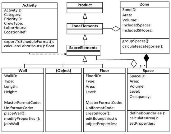 The first step in the methodology involves enriching BIM data with construction planning information. This helps to address the common fragmentation where essential scheduling knowledge, such as task dependencies, spatial zones, resource needs, and site constraints, is often isolated in external tools or documents. The framework embeds scheduling semantics directly into the BIM schema. As illustrated in Figure 3, the Unified Modeling Language (UML) diagram shows how physical components and spatial hierarchies (e.g., buildings, floors, zones) are structured and linked to construction tasks, resources, and material specifications. This transforms BIM from a geometric model into a semantically enriched representation that supports both spatial and process planning, enabling not only the “what” and “where” but also the “when” and “how” of construction activities. The enriched schema introduces new classes and attributes that connect building elements, work areas, resource estimates, and execution logic. Each BIM object is linked to corresponding scheduled activities and enhanced with metadata for planning and monitoring purposes. Following the Enhanced Planning Method proposed by [24], the model categorizes and locates tasks within spatial zones to facilitate AI-driven scheduling and improve planning.