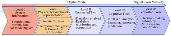 Integrating DT data enables real-time synchronization between construction plans and field progress. A DT is a live digital representation of the construction environment, continuously updated through IoT sensors and site data [6,12,17]. As illustrated in Figure 4, the digital twin maturity model outlines how capabilities progress from basic digital representations to advanced, intelligent systems.